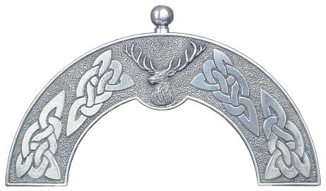 White dress sporran with stag cantle (Pewter top) The sporran is made with lorica and faux fur and is availble with either crossed or straight tassels.
